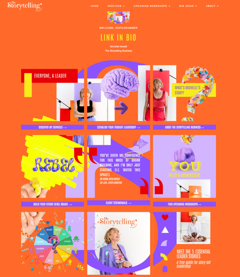 Instagram’s visual nature can capture the essence and energy of your brand through colour, motifs and key phrases. My new Instagram feed aims to capture the fun and disruptive side of my brand. I hope you get a sense of what it would feel like to work with me when you look at it. Yours could include infographics, quotes, illustrations or short video snippets that capture your energy.